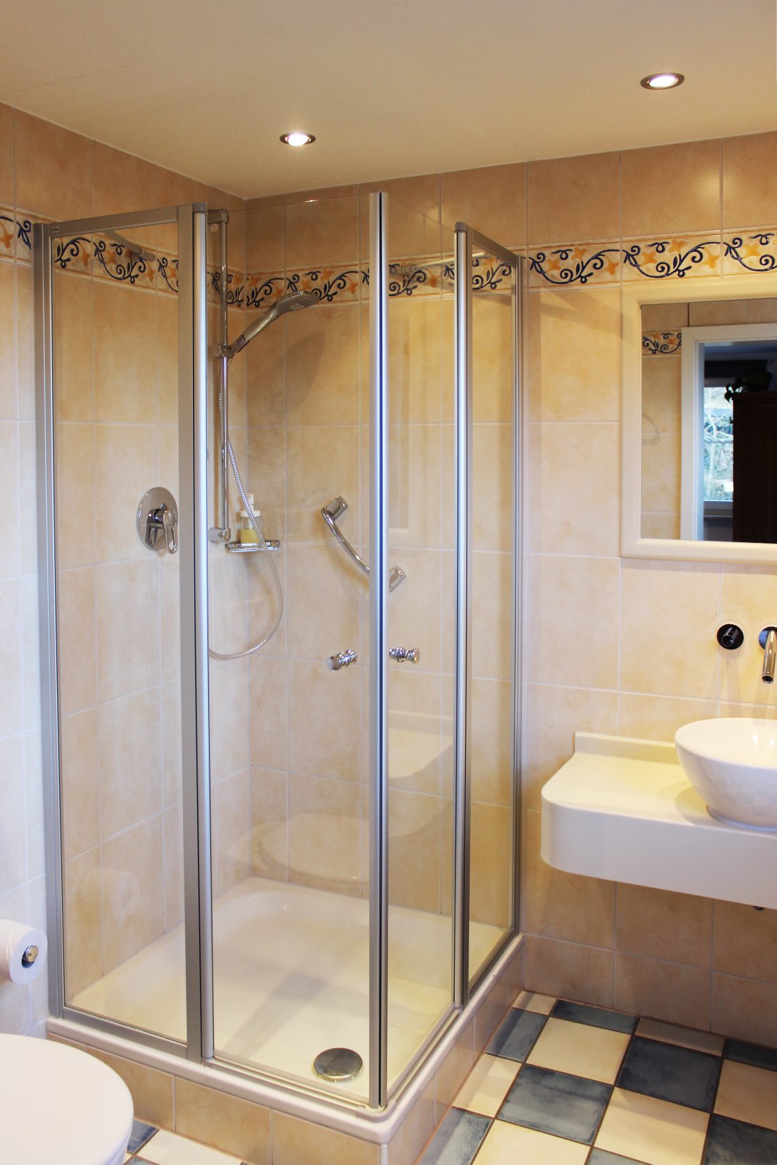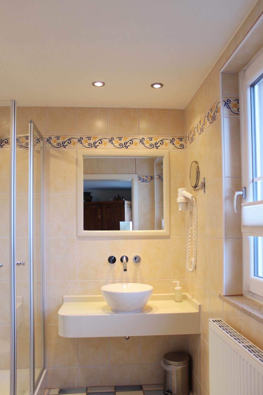 Das Hufeisen-Zimmer befindet sich zur Nord/West-Seite des Hauses und ist durch die vielen Fenster und das Tageslichtbad besonders hell. Das Doppelbett beträgt die Maße 1,80m x 2,00m.